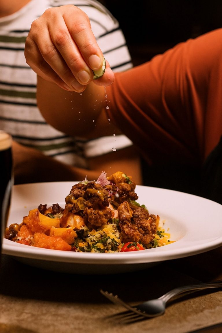 Kasundi, chou-fleur rôti, fromage halloumi, oignons frits, houmous